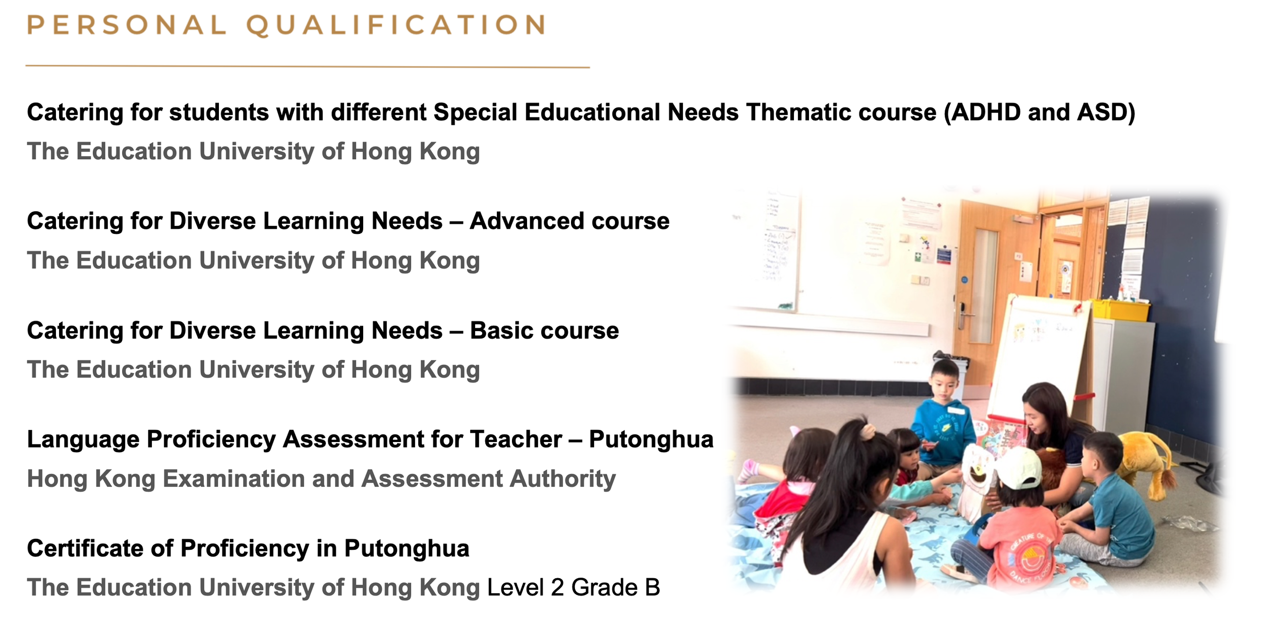 I graduated in 2014 from The Education University of Hong Kong with a Bachelor of Education (Honours) in Primary Chinese Education, minoring in Visual Arts. I also studied a Higher Diploma in Early Childhood Education. After graduating, I dedicated myself fully to the field of education and spent nearly eight years teaching at a government-subsidised primary school in Hong Kong. During those eight years, I taught Chinese and other academic subjects and was later promoted to the role of Special Educational Needs Coordinator (SENco), where I led efforts to support students with diverse learning needs across the entire school.
